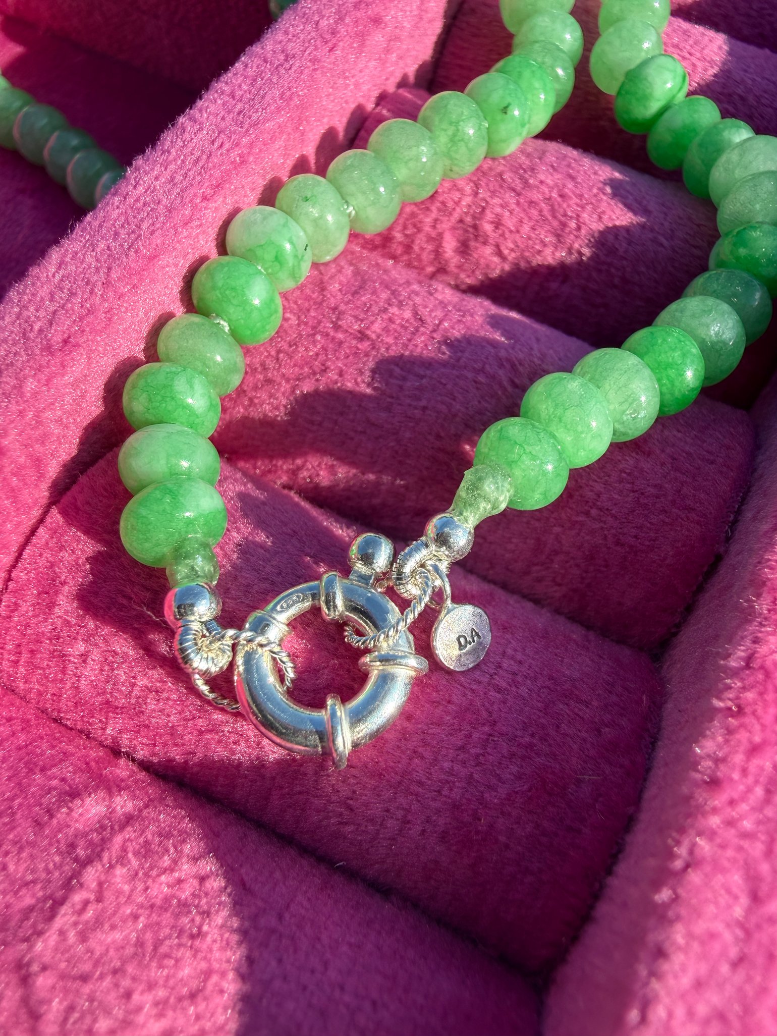 Individually hand knotted dyed green jade with sterling silver bolt clasp.