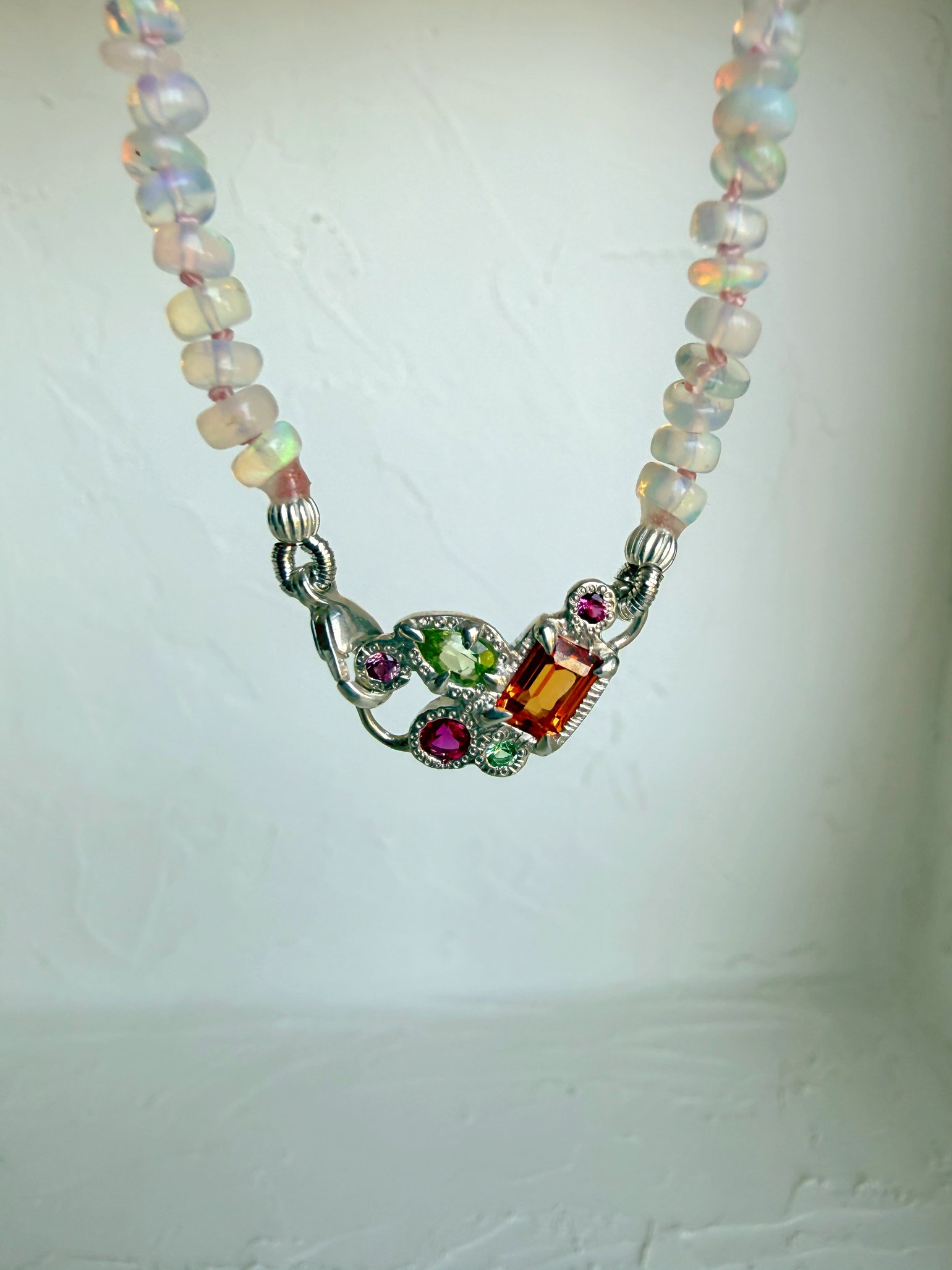 Gorgeous stand-out pendant fastening with lab created sapphires, tourmaline and natural pear shaped peridot with individually hand-knotted Ethiopian opal. Main emerald cut stone is a lab grown Padparadscha Sapphire.