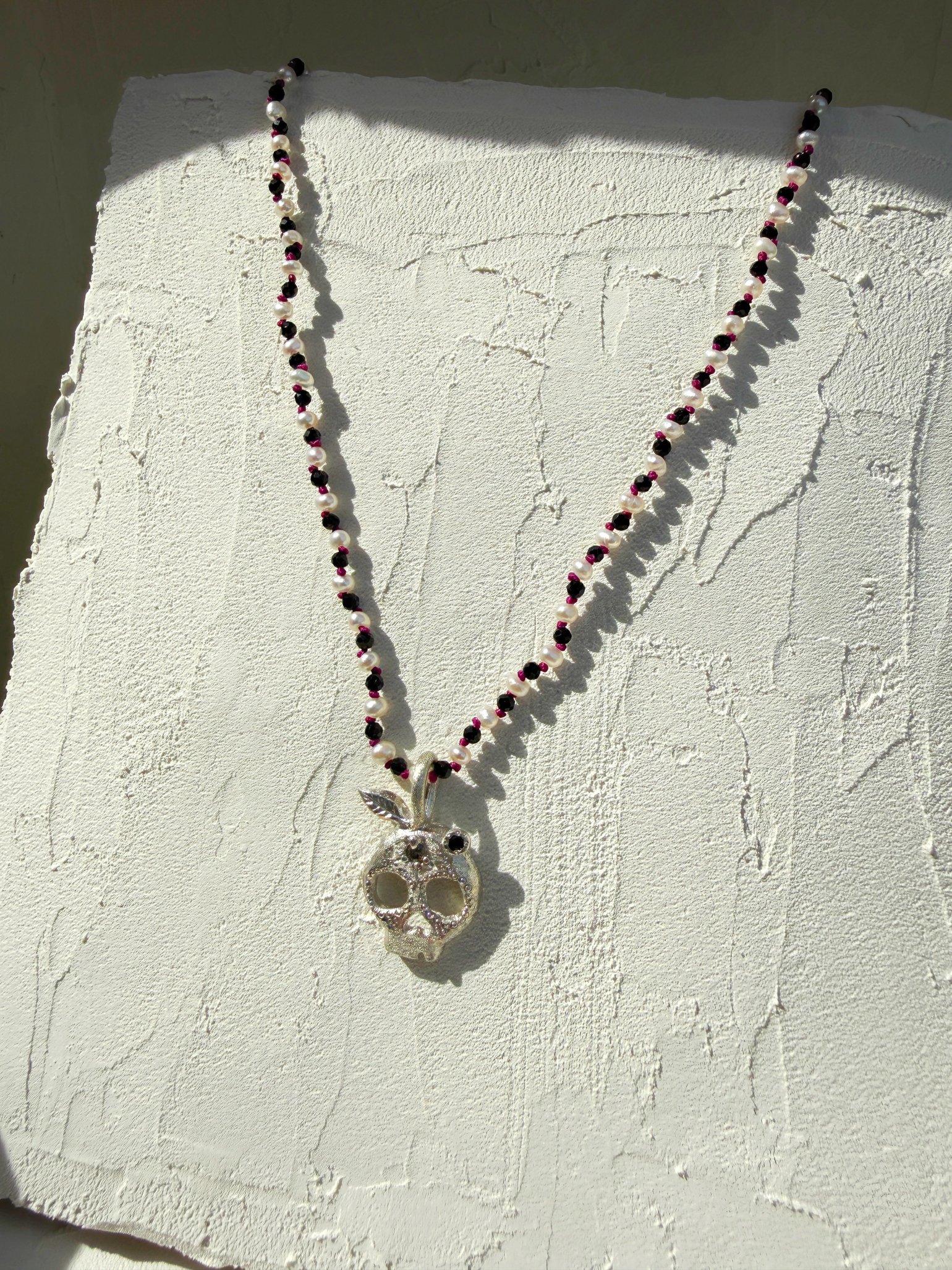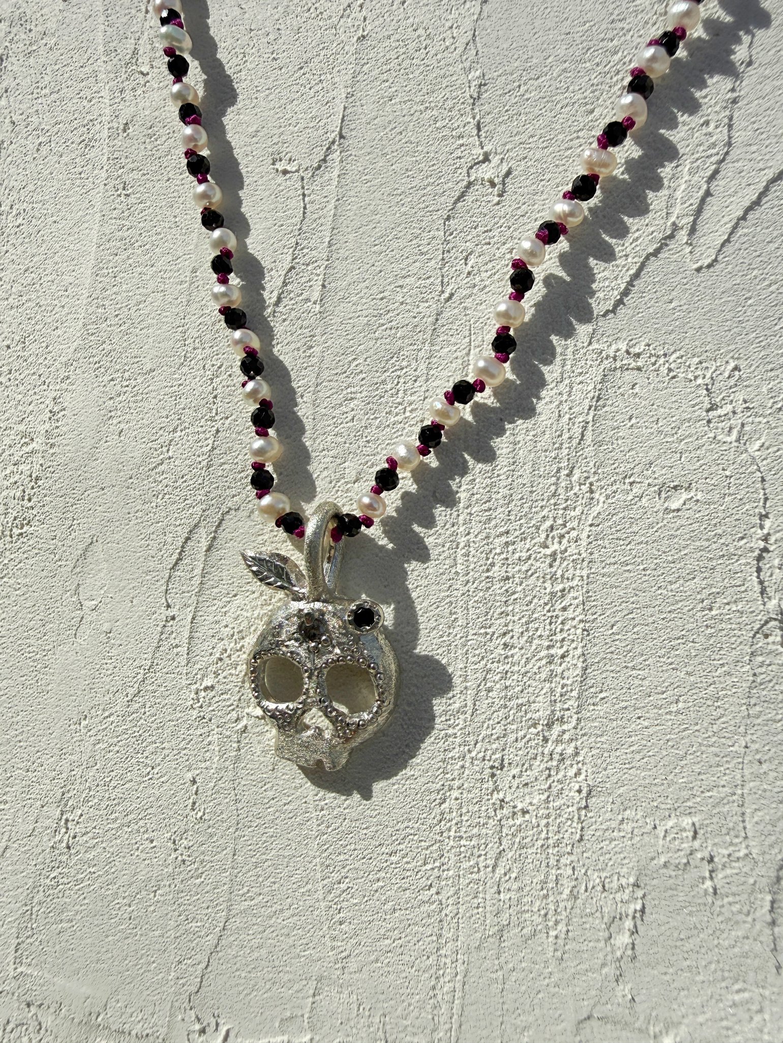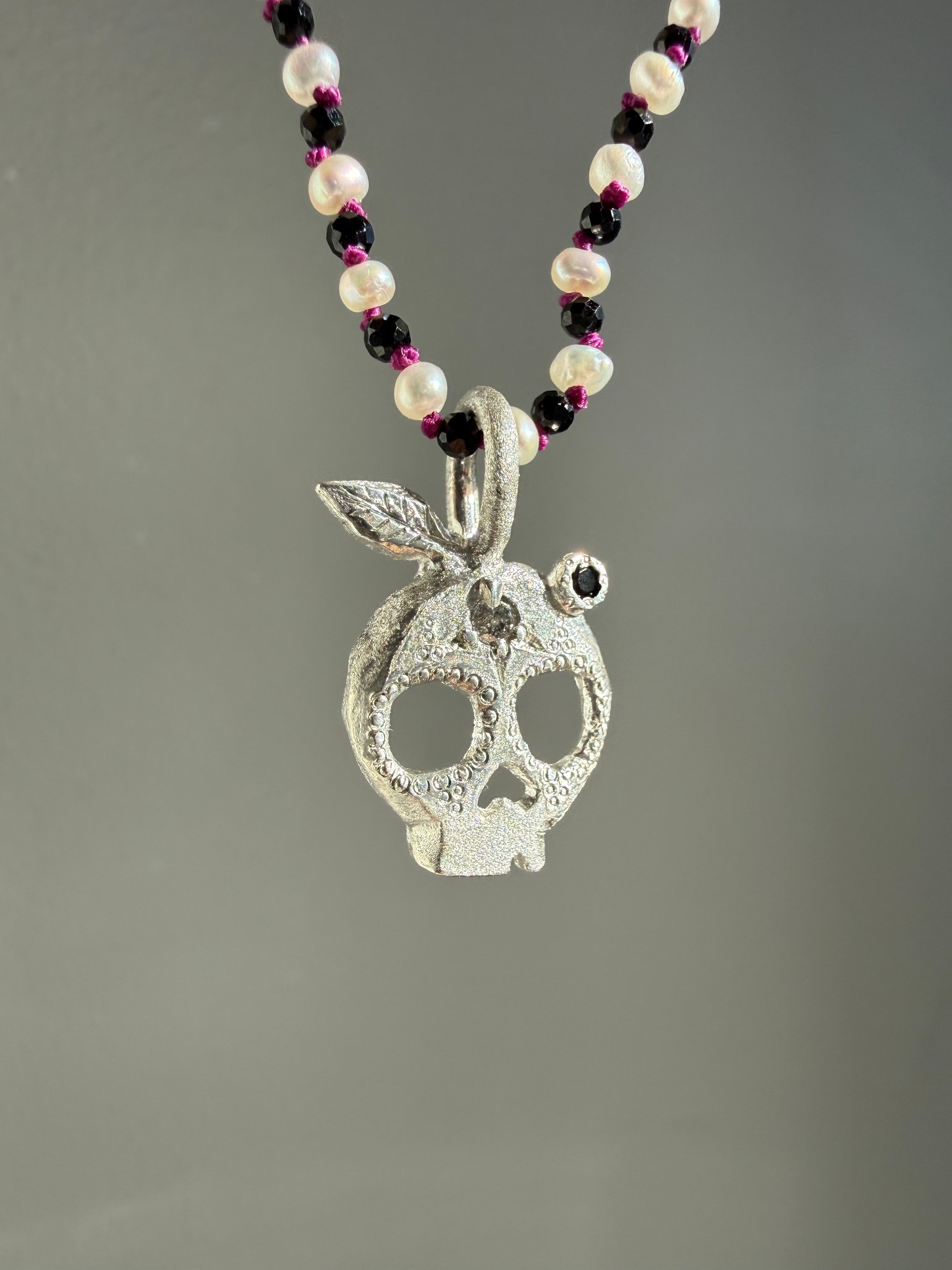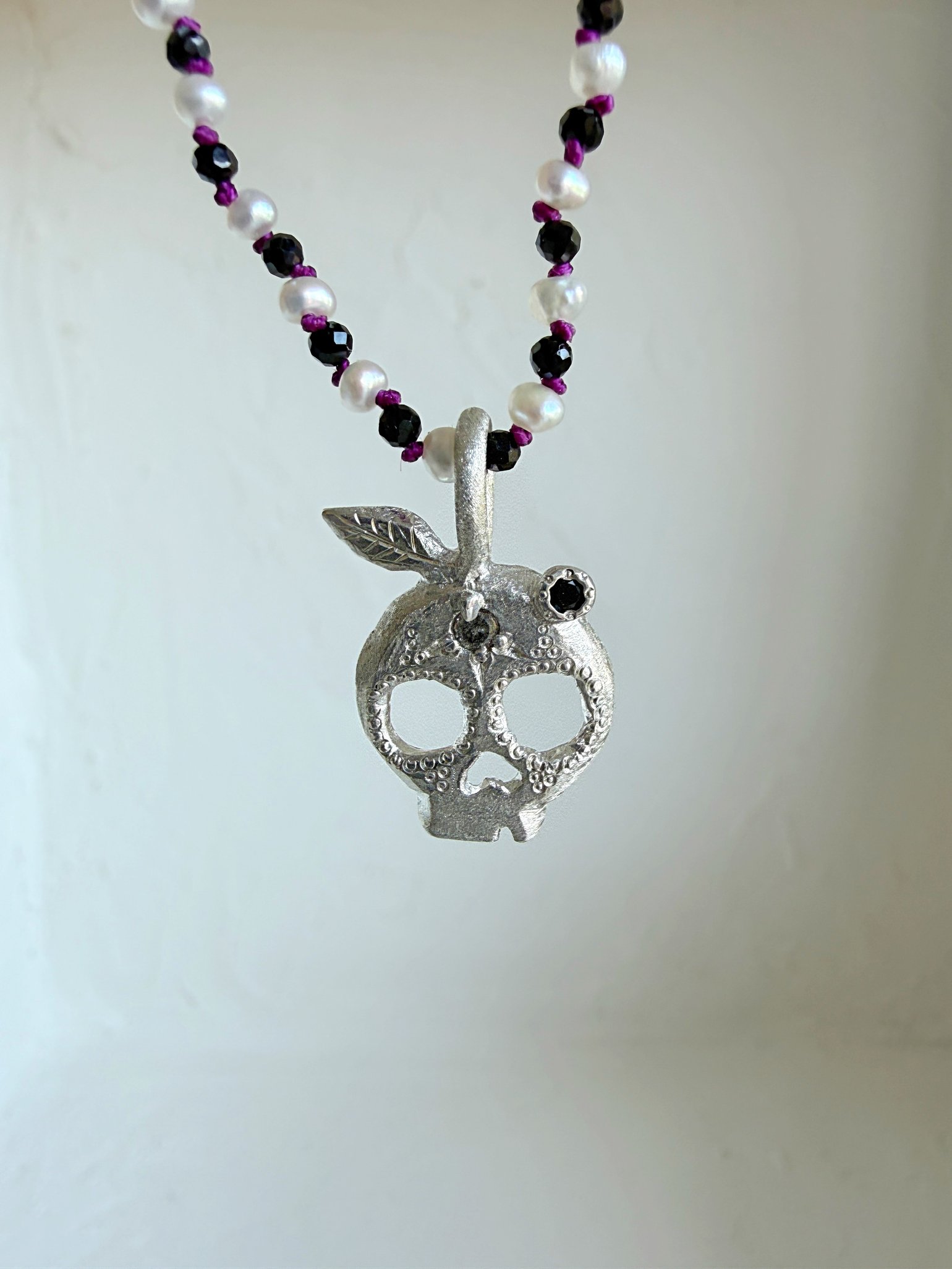 Sterling Silver skull pendant with salt and pepper diamond and black spinel, dangling on a tiny seed freshwater pearls and black spinel beads.